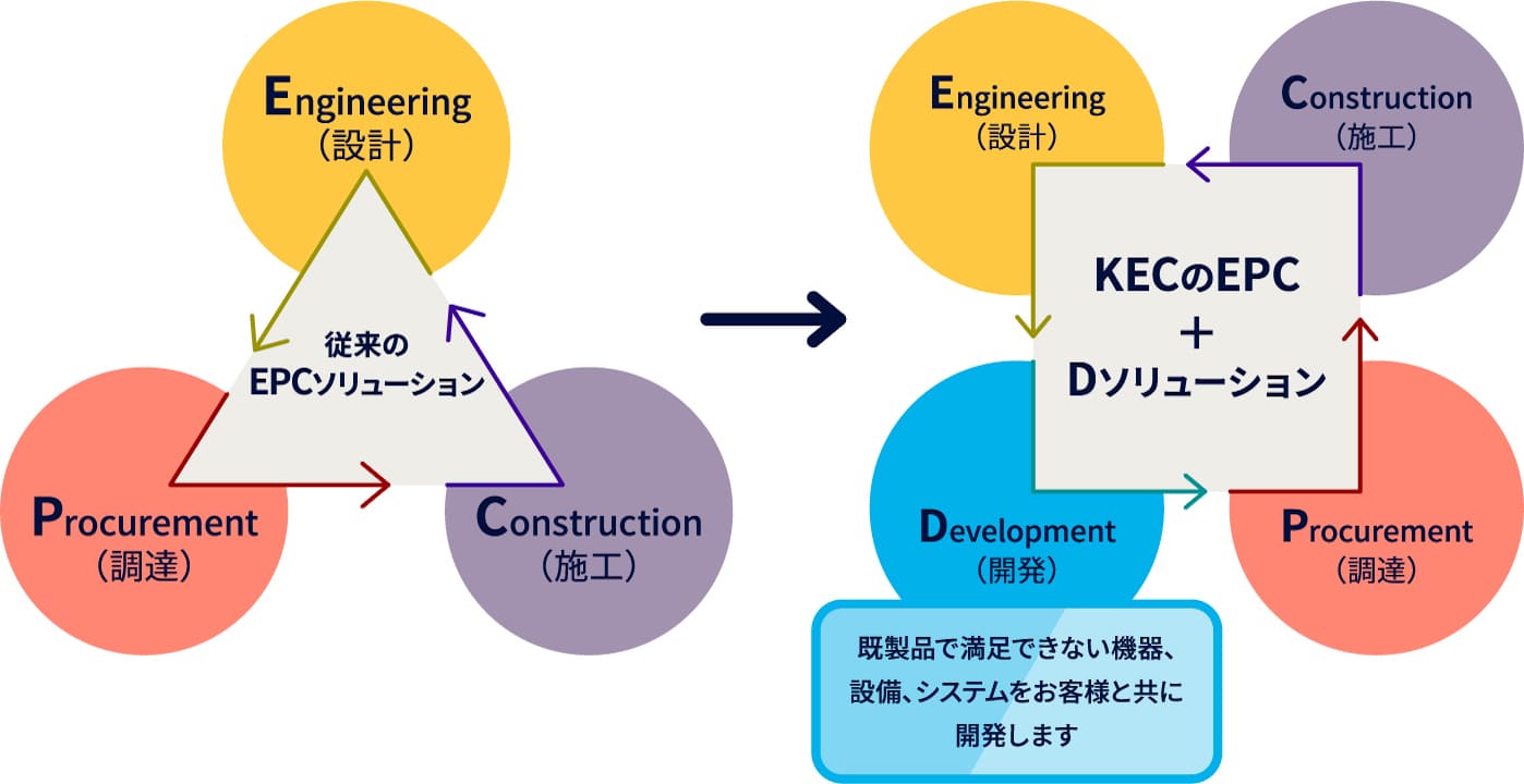KECは、総合エンジニアリング会社として、お客様の多様なご要望にお答えするべく、従来のEPCに開発の要素を加えた EPC+Dソリューションの提供を行っております。